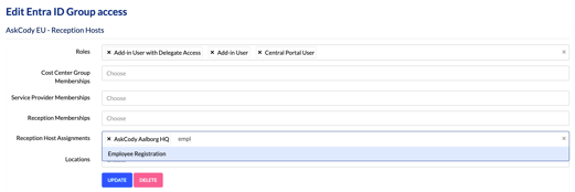 If your organization uses the automatic user sync service through App Provisioning and SCIM, you can assign hosts to receptions based on their Entra ID group memberships. This is the recommended approach because it keeps your host list up to date automatically.