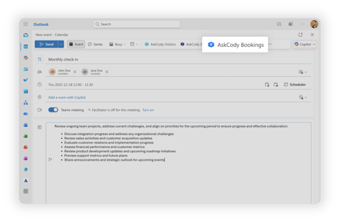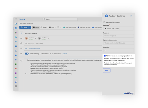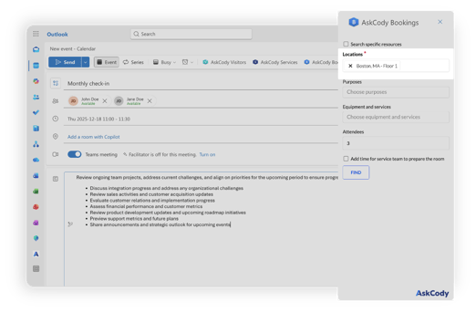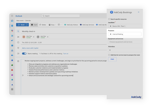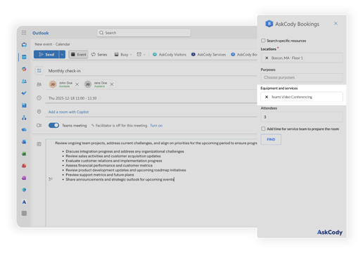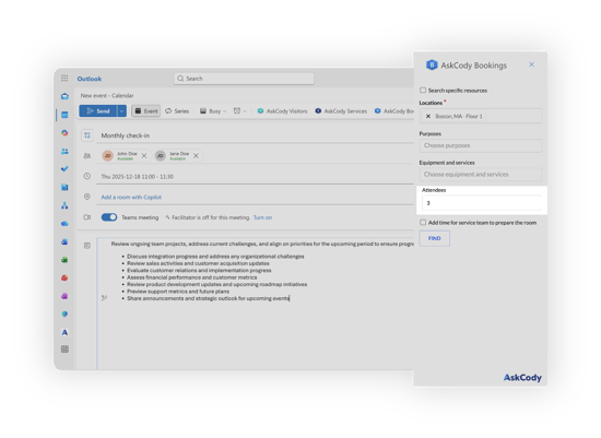 The AskCody Bookings add-in for Outlook helps you find and book meeting rooms and desks directly from your Outlook calendar. It allows you to search across locations, apply filters such as capacity, equipment, and purposes, and book the best available resource without leaving Outlook.