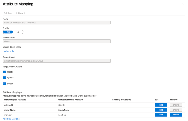 Then on the Attribute Mappings section click on Edit on the line with ‘externalId’ on the customappsso Attribute and ‘objectId’ in the Microsoft Entra ID Attribute: